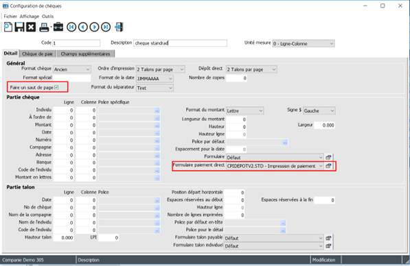 Le formulaire de chèque pour le paiement direct provient du formulaire identifié dans la Gestion des comptes de banque sous le champ Chèque Fournisseur – Format de dépôt.