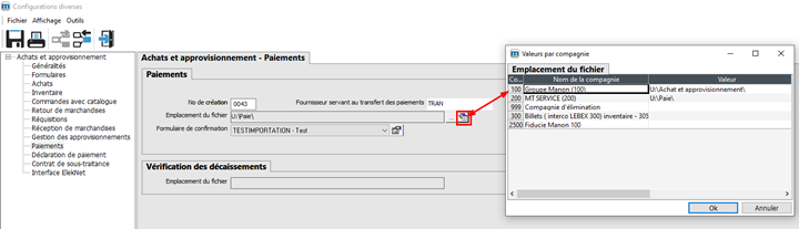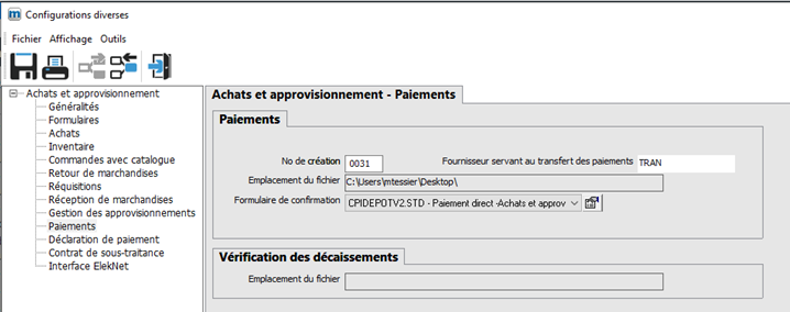 Cette option permet d’indiquer l’endroit où seront sauvegardés les fichiers de paiements directs, le numéro de création obligatoire pour la transmission des fichiers ainsi que le formulaire de confirmation de paiement personnalisé.