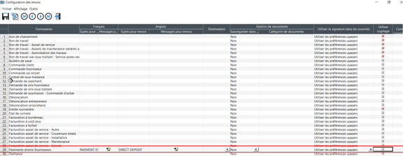Cette option permet de configurer, pour chaque formulaire, rapport ou autre défini dans la grille, un sujet et un message qui seront utilisés lors de l’envoi massif de courriels. Cette option permet également d’instaurer la sauvegarde des formulaires ou des rapports dans la Gestion des documents.