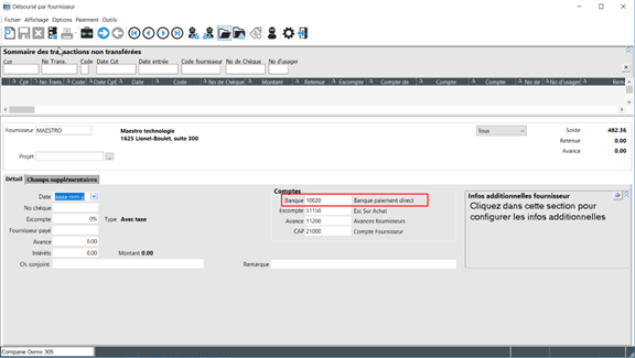 Si le virement bancaire est activé pour le fournisseur, le compte de banque est automatiquement modifié pour le compte de banque transitoire pour le paiement direct des fournisseurs identifiés dans les Configurations générales.